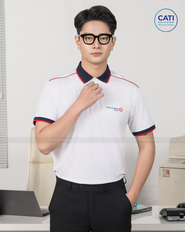 Áo Thun Đồng Phục Công Ty chất liệu Lacoste Airycool Cao cấp màu trắng nhấn mí cầu vai tạo điểm nhấn. Thiết kế Miễn phí theo yêu cầu. Hỗ trợ may đo hoặc may size theo yêu cầu.