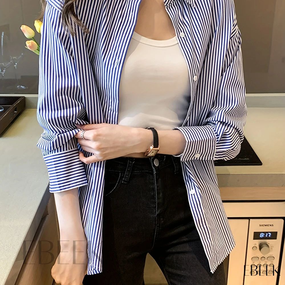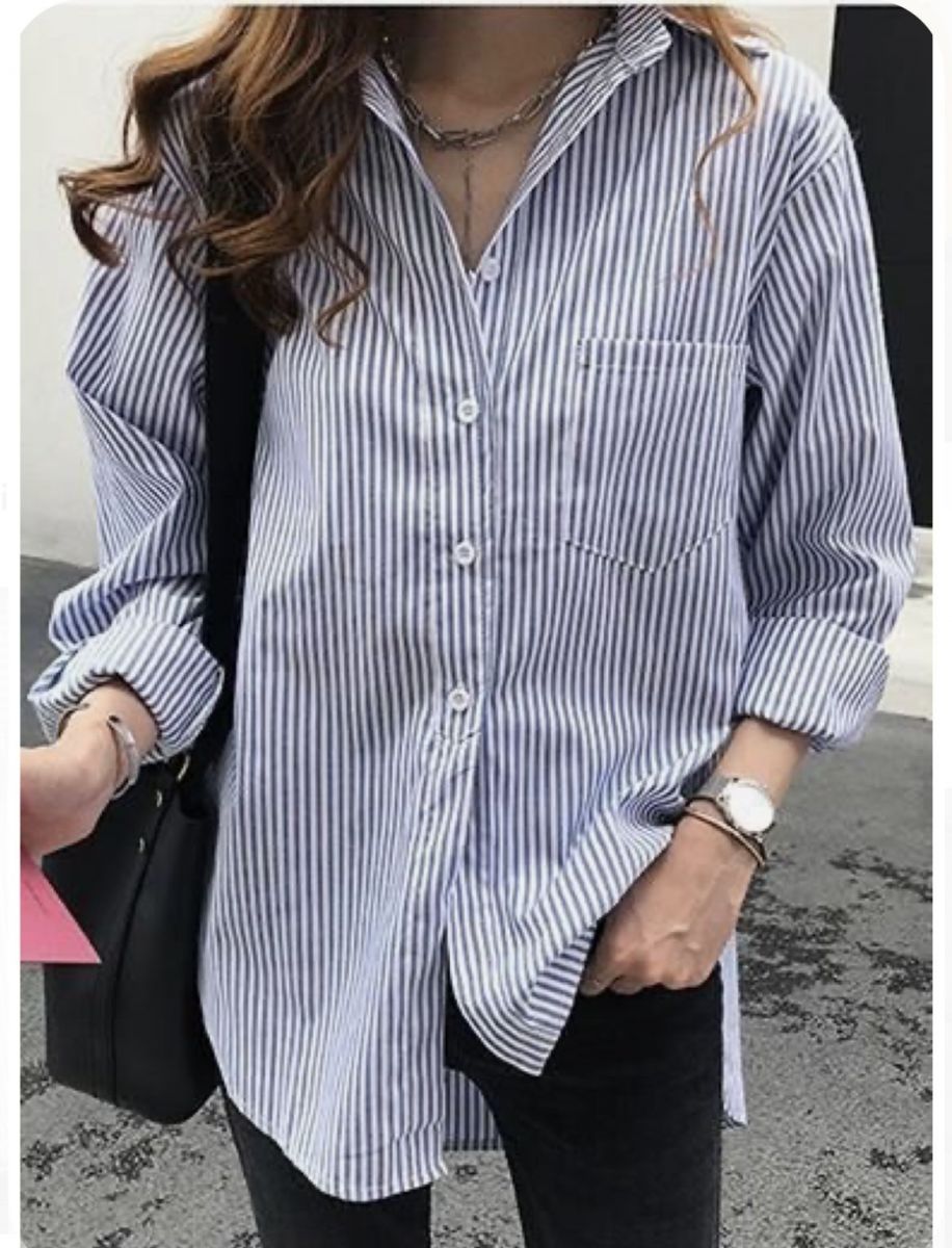 Mẫu áo sơ mi form rộng cá tính kẻ sọc thường thấy các cô nàng mặc nhiều nhất ở môi trường công sở bởi sự hiện đại và năng động nhưng vẫn giữ nét thanh lịch. Với thiết kế form rộng giúp che khuyết điểm tốt cho các chị em có vòng 2 lớn. Vì vậy nếu cô nàng nào muốn trông thon gọn hơn thì có thể thử ngay item này.