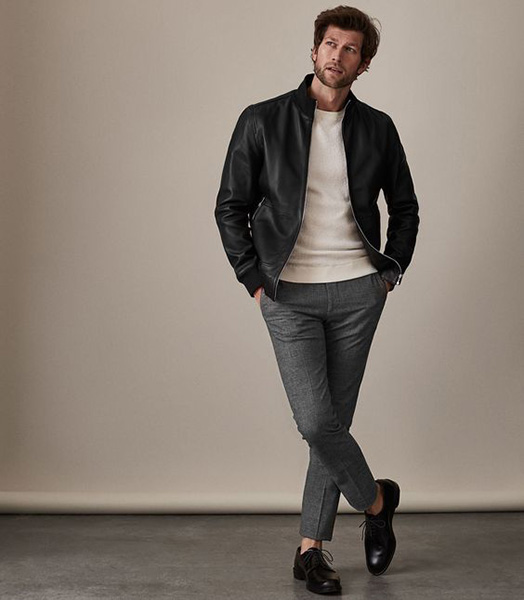 Phong cách cực kỳ nam tính khi kết hợp áo khoác da và quần kaki.