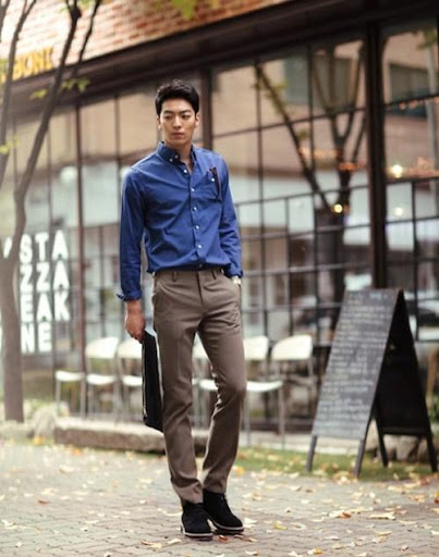 Lịch lãm và chuyên nghiệp khi kết hợp áo sơ mi màu xanh và quần kaki màu nâu.