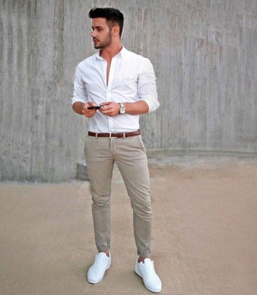 Trẻ trung và nam tính khi kết hợp áo sơmi trắng và quần kaki skinny.