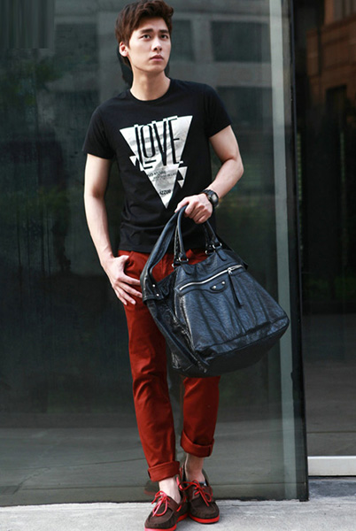 Mạng đậm phong cách đường phố khi kết hợp áo thun màu đen với quần kaki màu đỏ nổi bật.
