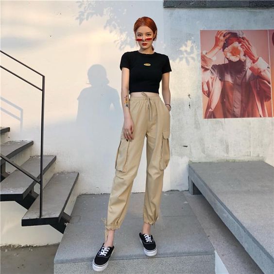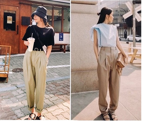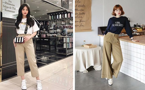 Đây là sự kết hợp phổ biến của các đồ thời trang trẻ trung. Bạn chỉ cần chọn chiếc quần kaki ôm lưng cao là có thể thoải mái diện chúng.
