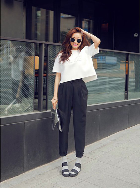Trẻ trung năng động khi kết hợp áo thun croptop màu trắng và quần kaki baggy màu đen.