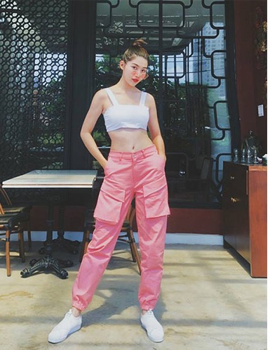 Ngọt ngào cá tính với áo thun hai dây màu trắng kết hợp với quần kaki jogger màu hồng.