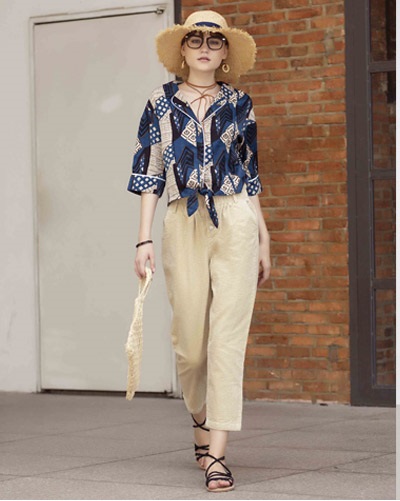 Nổi bật và màu sắc khi kết hợp áo sơ mi họa tiết hoa và quần kaki màu kem.